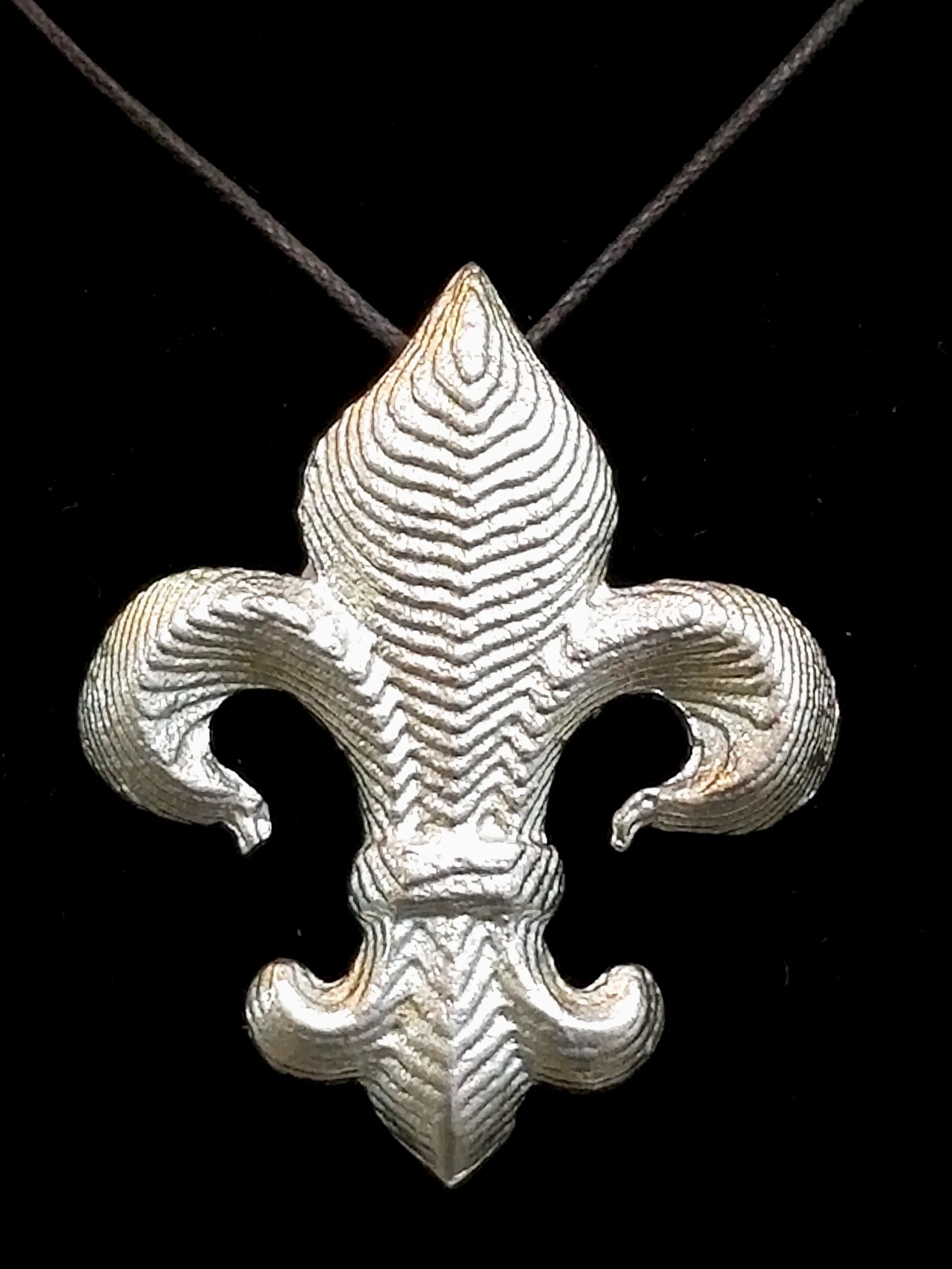 A pendant necklace featuring a silver-tone fleur-de-lis design with engraved details, hanging against a black background.